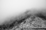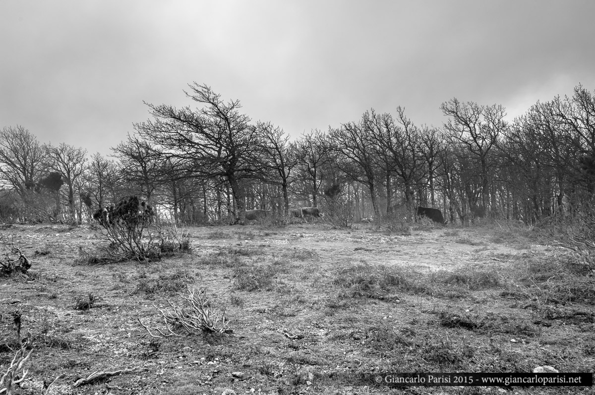 Siamo al margine della foresta ed il paesaggio muta. La foresta lascia spazio alla classica gariga del versante ionico dell’Aspromonte, ove sul suolo involuto l’Erica Arborea, i Lecci e la Roverella resistono coraggiosamente ai venti ed alle intemperie. La percorriamo verso il ciglio che avevamo scorto in precedenza, ma una fitta nebbia si sta levando proprio in quel momento, coprendo completamente la vista del mare e inghiottendo ogni cosa. Non c’è speranza di realizzare fotografie panoramiche, anche se da lì la vista sarebbe stata meravigliosa. Facendo qualche calcolo mi rendo conto di essere grossomodo sul tratto d’Aspromonte che si trova a monte dell’abitato di Cirella di Platì, quindi a valle dovrebbero trovarsi Monte Pinticudi, Monte Iacono e Monte Colaciuri, ma è impossibile individuarli.