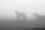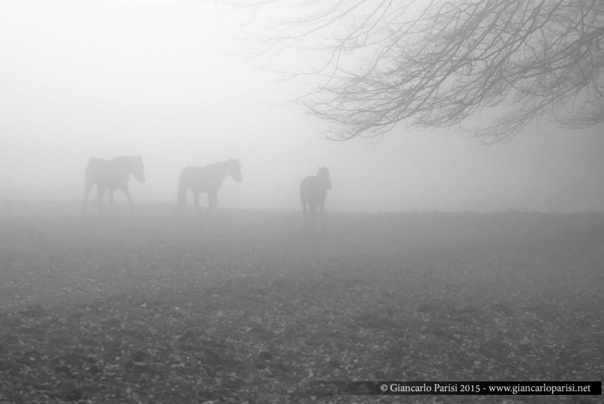 Mi incammino tra gli alberi, addentrandomi un poco nel bosco e improvvisamente mi ritrovo in un piccolo angolo di paradiso. Un ruscelletto scorre sornione nel sottobosco, in un tratto in cui si stende un tappeto di muschio verde brillante, a tratti ricoperto della calda coperta di foglie di Faggio. Mi intrattengo a fotografare quando, dopo alcuni minuti, odo degli sbruffi e uno scalpitio di zoccoli poco lontano. Non vedo nulla nella nebbia, dunque mi dirigo nella direzione dalla quale avevo sentito provenire i rumori e, poco dopo, ecco apparire a breve distanza le sagome inconfondibili di tre cavalli. Non si lasciano avvicinare più di tanto, dunque sono costretto a sostituire l’obiettivo con uno più lungo. Così facendo riesco a riprendere la visione epica che mi si para davanti agli occhi. Giusto il tempo di qualche scatto, perchè poi gli animali, stanchi della mia perseveranza, si allontanano inesorabilmente.
