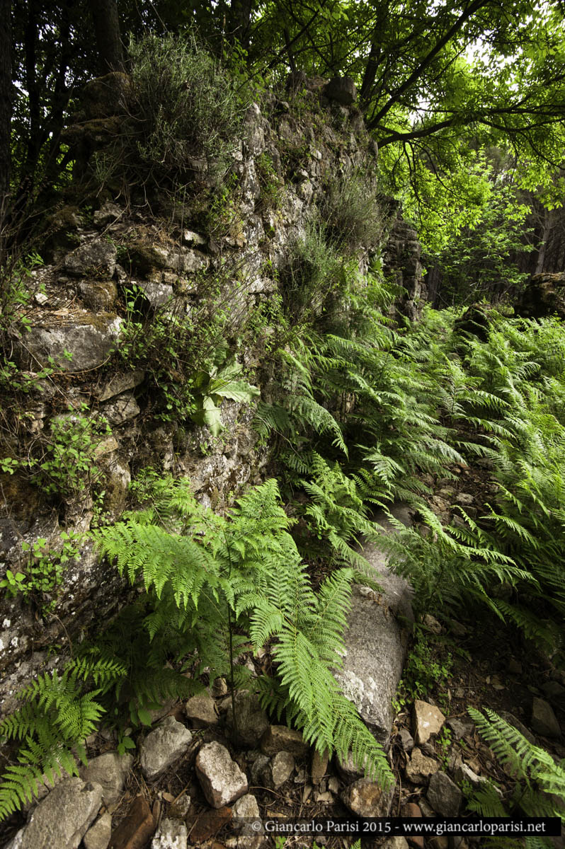 La luce filtra leggera nel bosco, illuminando le vetuste mura con un taglio cinematografico. Il sito è inondato di vegetazione e l’interno del perimetro dell’edificio è invaso da un tappeto di felci di un verde brillante.